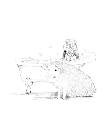 A playful, indulgent concept featuring Freyja in a pig-footed claw-foot tub overflowing with bubbles, guarded by a large, masculine Mangalitsa boar. Tusks, form, and anatomy were revised to strengthen the character, adding personality and whimsy to the scene.