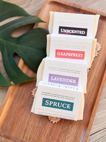 The two GoldenBristle illustrations instantly elevate the soap line, especially with the gold foil accent. The artwork is flexible for packaging, merchandising, and future creative expansions. The sleeve-and-label system also gives Tusk Farm a scalable, customizable way to introduce new scents without reinventing the packaging each time.